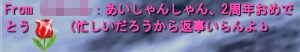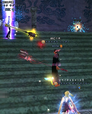 キャー!かんちょうがセクハラよー!! (あえて名前消さないよw) !?(゚Д゚; 三 ;゚Д゚) こちらは名前消させてもらいましたwもふもふの獣さんですよ!w しかし女子には言われません。あいしゃですヽ(`Д´)ノ こんばんはヽ(`Д´)ノ 4月3日が、ケセラセラの設立2年目でした。 そのお祝いをしようと チャイナドレスの美女(仮名)さんが企画して下さった イベントが、4月26日20時より開催されました。 2周年だ! みんなでワッショイしようぜ、おぱんつ達! イベント内容は下の記事に書いたとおり ・マラソン大会 ・サバイバルかくれんぼ ・花火大会 ぱんつダンスはありませんでした(照 ・・・鬼嫁ジャンプはあったが!!w まずは、マラソン大会。 剣仙の長老前から走り、ゴールは祖龍東の長老前。 ルールはただひたすら走るだけ! (右上の地図は消してもらいます) 走る気満々で会場に行ったら、 「Youは、ランナー達の見張り係」 と言われました(*´д`*) 事前に確認はしなきゃいけませんねw ということで、足の速さで各自走る順番を決める。 マリーさんがトップで走るということなので ついて行けば、みんなも後ろから来るだろうと 上から見守る作戦で、マリーさんに同行させてもらいました(*´д`*) 5分後・・・ マリーさん(゚Д゚; 三 ;゚Д゚) ここ、スタートの城だよww 巡り巡って、戻ってきてましたw しかも、誰にも会わず、ずっと2人きりでした!w なんというデート!www その後、ブラッドデスに絡まれつつ 無事に祖龍についたと思ったら ・・・祖龍で迷子にナッテタ!!(゚Д゚; 三 ;゚Д゚) そして、前回も迷子クイーンの座を争っていた しもーぬとあにょすの二人が、今回も激しく争ってましたw ↑迷子のしもーぬの様子 剣仙から出発して、 漁村付近でウロウロしていたしもーぬと、ゴールを通り越して反対側に居たあにょすww この2人の辿った道を、全部記録して見てみたいですw 面白かったですw 笑わせてくれて、ありがとう!!ww ゴールにて こんな名前のペットが2人も!!! 感激して、SSを綺麗に撮ろうと思ったら ・・・おパンツが撮れてました。 (*´д`*)ごめんなさい。 狙ったんじゃないよ!ww その後は、樹下に行ってかくれんぼ大会。 最初の鬼は実行委員の4人。鬼に見つかった人が鬼に、 その鬼に見つかった人がまた鬼に・・・と鬼が増えていく恒例のサバイバルかくれんぼ! ワープ師のおねーさんの隣に居た、だおだおヽ(`Д´)ノ 隠れてないし!ハゲじゃないし!! ヽ(`Д´)ノムキョー!! もじゃが鬼の近くの柱に隠れて見つめてましたw そこ、絶対見つかるから! っていうか、もう見つかってるから!ww かくれんぼでも、いっぱい笑わせてもらいましたw みんな、ありがとねw 途中、ガングロ姐さんから お祝いのメッセージを頂きました! ありがとう姐さん!(´Д⊂ だがしかし、返事はするんだぜw しかもその後、現場に駆けつけて来てくれてありがとう!(´Д⊂ そして、最後に、 霜降の城の上で花火! いっぱいいっぱい上がりました。 ありがとう!ケセラセラ! ありがとう!チャイナドレスの美女(仮名)さん! ありがとう!みんな! 最後の方は、これまでの事を思い出して なんだか泣きそうになってましたが 本当に、楽しかった!! みんなの楽しそうな顔が見れて嬉しかったな。 本当にありがとう!! そして、ここからは重要なお知らせです。 ギルメンの皆様にはお知らせしてありますが Gケセラセラは、このイベントをもって 休止させて頂くことになりました。 詳細やご挨拶は、次にあがる記事に書かせて頂きますね。 追伸:みゆさん、コメントありがとうございました^^ コメント欄を消しちゃったので、ここでの返信でごめんなさい! 2009/05/13(Wed) 16:11:54
