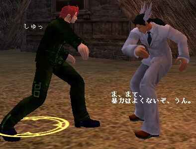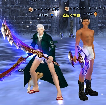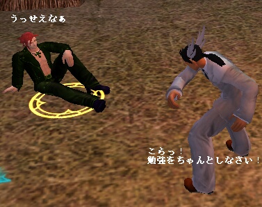 師匠(上)/弟子(下) 弟子:「師匠!自分を見つめ直す旅に出てまいります!」「わん!」 師匠:「うむ、道中気を付けてな」 弟子:「おやつは500円までですか?」 師匠:「いや、300円までじゃ」 師匠(中)/弟子A(右)/弟子B(左) 弟子A:「師匠!暑いので裸にならせて貰いました!」 師匠:「馬鹿者!修行がたらん!」 弟子B:「あつい~アイス食べたい~」 師匠:「うむ。買っておいで、イチゴ味2本でね」 弟子A:「師匠・・・!扱いが違う上に、1本足りない気が・・・」 師匠:「気のせいじゃ♪」 面白いSSがあったので、 なんとなくセリフを付けてみましたw ほっほっw あべさんの武器メモ 戦闘中、器用に切り替えして使ってますなw すばらしーw しかし、その実態は ケセラのぱんつまんだw 2007/09/23(Sun) 19:05:46