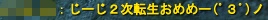 時期的にクジかと思わせておいて、 実は合成です。 どうも、あいしゃです。こんばんは(`・ω・´)ノ 前回、1次転生から約8ヶ月。 ついに。 ↓ 進化するマスコット・・・!! あべし銘の杖もようやく装備することができ、 精霊のにーちゃん、遂に2次転生!!(´▽`) これまで関わって下さった皆さん、本当にありがとう!! 2次転生の模様をダイジェストで! 変な島に飛ばされてオロオロしましたが 魔99Dでは、死人が出ることもなく 黄金2つと本が!ヽ(゚∀゚ヽ 三 ノ゚∀゚)ノ おかーさんがこっそり ごーるどまんの邪魔をしていましたw この為か、現在ごーるどまんはスランプに陥っておりますw ダンジョンにつき合ってくれた皆さん、 本当にありがとうございました! 未だに道を覚えていないのは秘密です!! マスコットが進化する時 ケセラのみんなが集まってきてくれました(´Д⊂ ありがとうありがとう ザワザワ しかし、ここでKYにトイレ放置 その間に もじゃがフライング世界チャしてたヽ(`Д´)ノ トイレから帰ってきたらおめでとうの囁きがきてて焦った!!w まだです!まだまだ!w アーユーレデー? イェーイ! イェアアアアアアアアアアア!! イヤアアアアアアアアアアアア!! ナンカチガウワアアアアアア(;゚Д゚) そして 踏まれる(´Д⊂ 沢山のお祝いのお言葉を世界チャ、囁き、ギルチャで頂きまして 本当にありがとうございました<(_ _)> アイスは1日1本 我が家のしきたりです(*´д`*) 皆さん、本当にありがとう。 ここまで来る道のりは長かったけれども いつも明るく楽しく居られたのは皆さんのお陰です。 まだまだ、この先へと進んでいきたいと思っております。 これからも完美世界を一緒に楽しんで下さい<(_ _)> 移転してからリンクさせて頂こうと思っていたのですが 移転作業がなかなか進まず・・・・orz 遅くなりましたが、コチラに先に リンクを追加させて頂きます!!(´Д⊂ ●ぱふぇわーるど ‐甘味世界‐ カペラワールドの白玉さん、善哉さんのブログです。 cβの頃からずっと見てましたあああ!白玉さんに囁きを頂いた時は 本当にビックリしました!! ギルドの運営に、イベントに・・応援しております!(`・ω・´)ノ 次のイベントにはこっそりもぐりこみたいなぁw ●かんぐり。 ぐりっぐりっぐりぐりっ(`・ω・´) ケセラセラの急成長株ぐりさんのブログ! コッソリ誰かがえろ発言しないかいつも目を光らせている エロ親父でもあります(^^)ニコ 「夕べはお楽しみでしたね」 この台詞がわかる人がいるとは思いませんでしたw ●ぱぁーわぁー☆ いつもノリの良い珠さんのブログw 月一で行われるぱんつ祭りの活躍を期待してますぞ!!w トラックバック抽選で浴衣を当てるという強運もすごい! コッソリ覗いたんですが、妖精さんいい装備でしたw これからもよろしくねーーー!!ノノ 2008/08/01(Fri) 21:42:18